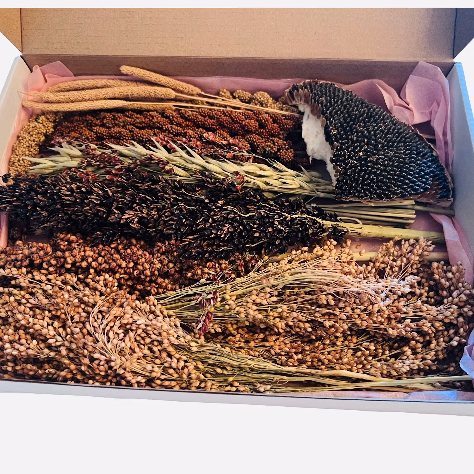 Vi har satt sammen en vakker overraskelsesboks med 200g ulike naturlige sprays + 30g solsikkehode. Perfekt for foraging, dekorasjon og naturlig gnaging! 🌾🐹