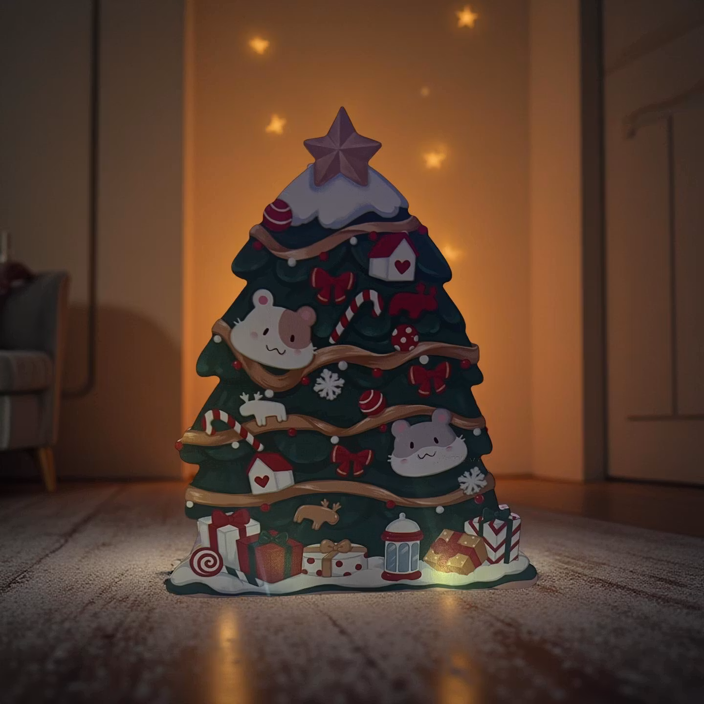 Et koselig julehus formet som et lite juletre – perfekt for å skape ekte julestemning i buret!